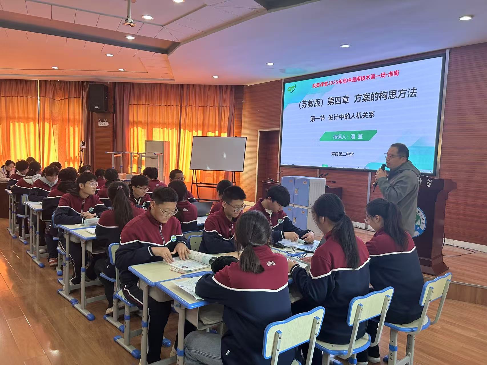 随后,寿县二中潘登老师执教苏教版必修一第四章《设计中的人机关系》。他以“探析校园储物柜”为切入点,通过“发现问题——拆解问题——构思方案”三环节引导学生实践。课堂聚焦“以人为本”的核心主旨,让学生在思维碰撞中深刻理解人机关系本质,课堂探究氛围浓厚。